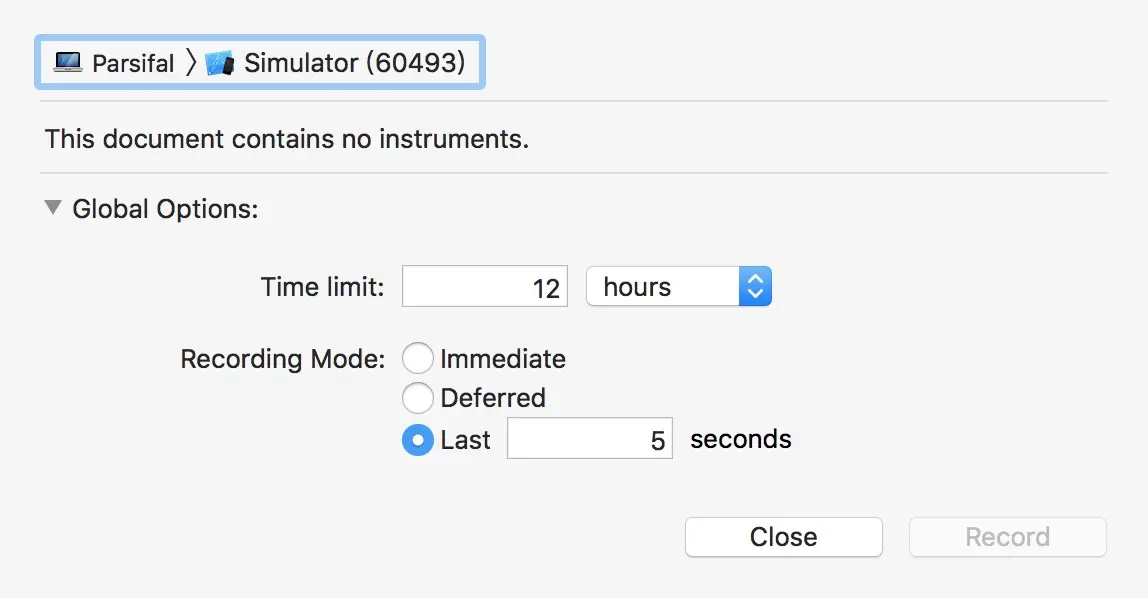当创建一个用来测试含有大量输入数据的 Instrument 时,使用『最后 5 秒记录模式』则是我们目前最好的选择。这一选项我们可以在 “File -> Recording Options” 里找到。如下图: