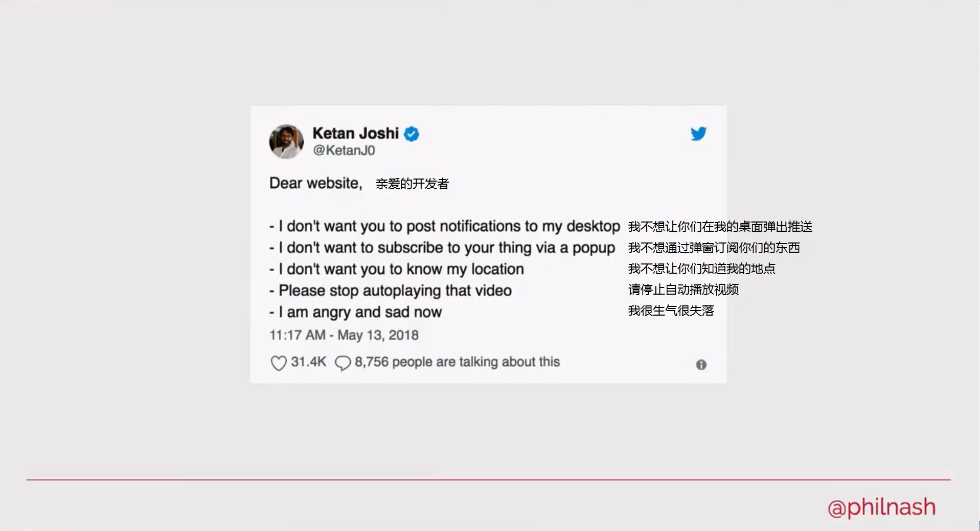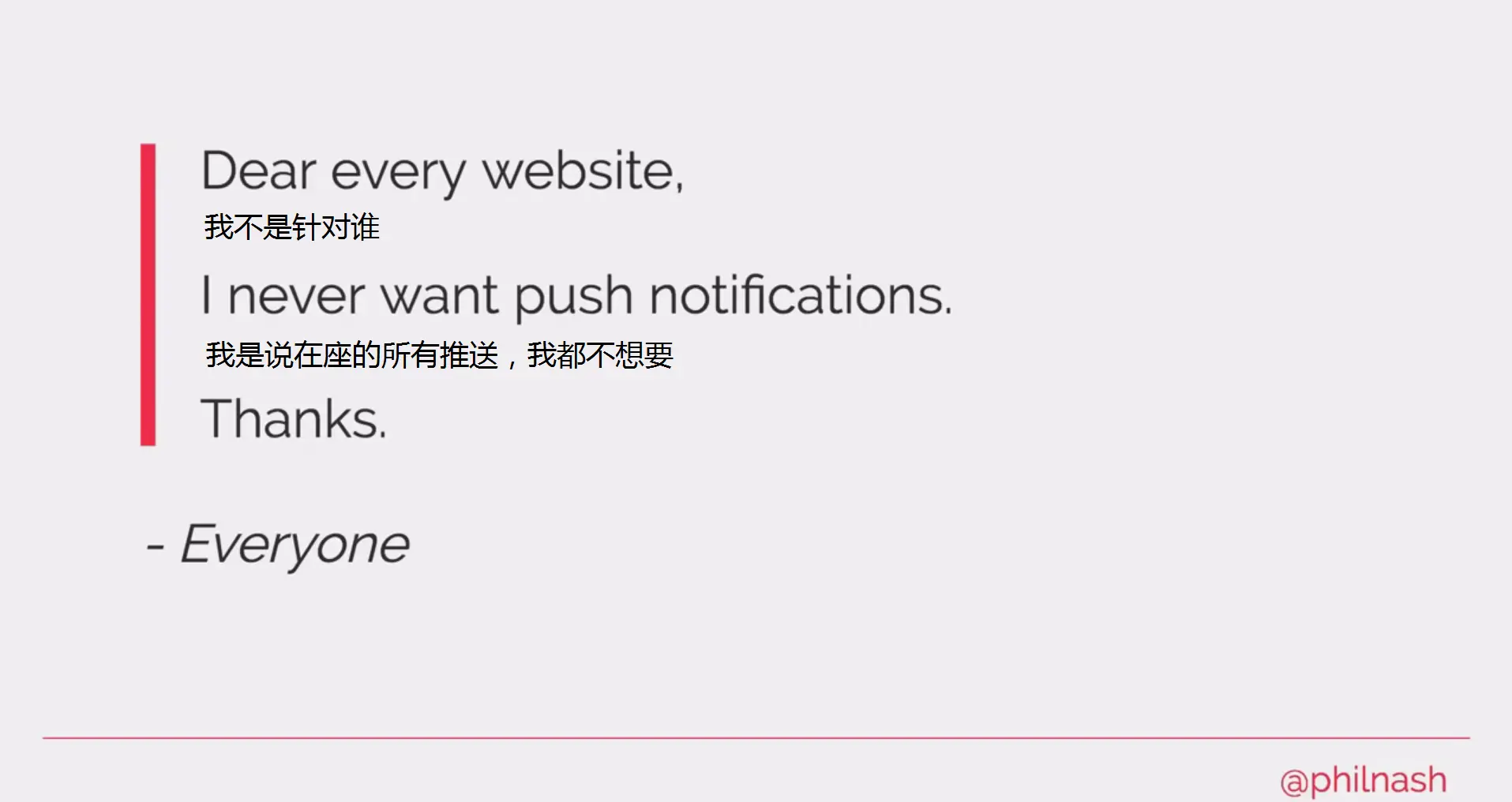 很多刚入门的开发者都以为W3C是一个金字塔顶端的组织,其实不是的,每个人都可以参与到未来W3C标准的制定中,本次演讲的演讲者Phil就是如此,针对如何更好的获取推送权限,他在WICG中提出了一个建议,即在申请权限时,要先与用户进行交互确认后再申请权限,不管开发者对此持什么意见,都可以在(WICG/interventions/issues/49)中发表自己的意见,只要见解足够有说服力,每个人都可以成为规则的制定者。最后,也是Phil反复强调的,就是永远不要在用户刚进入你的页面时就向他申请权限。