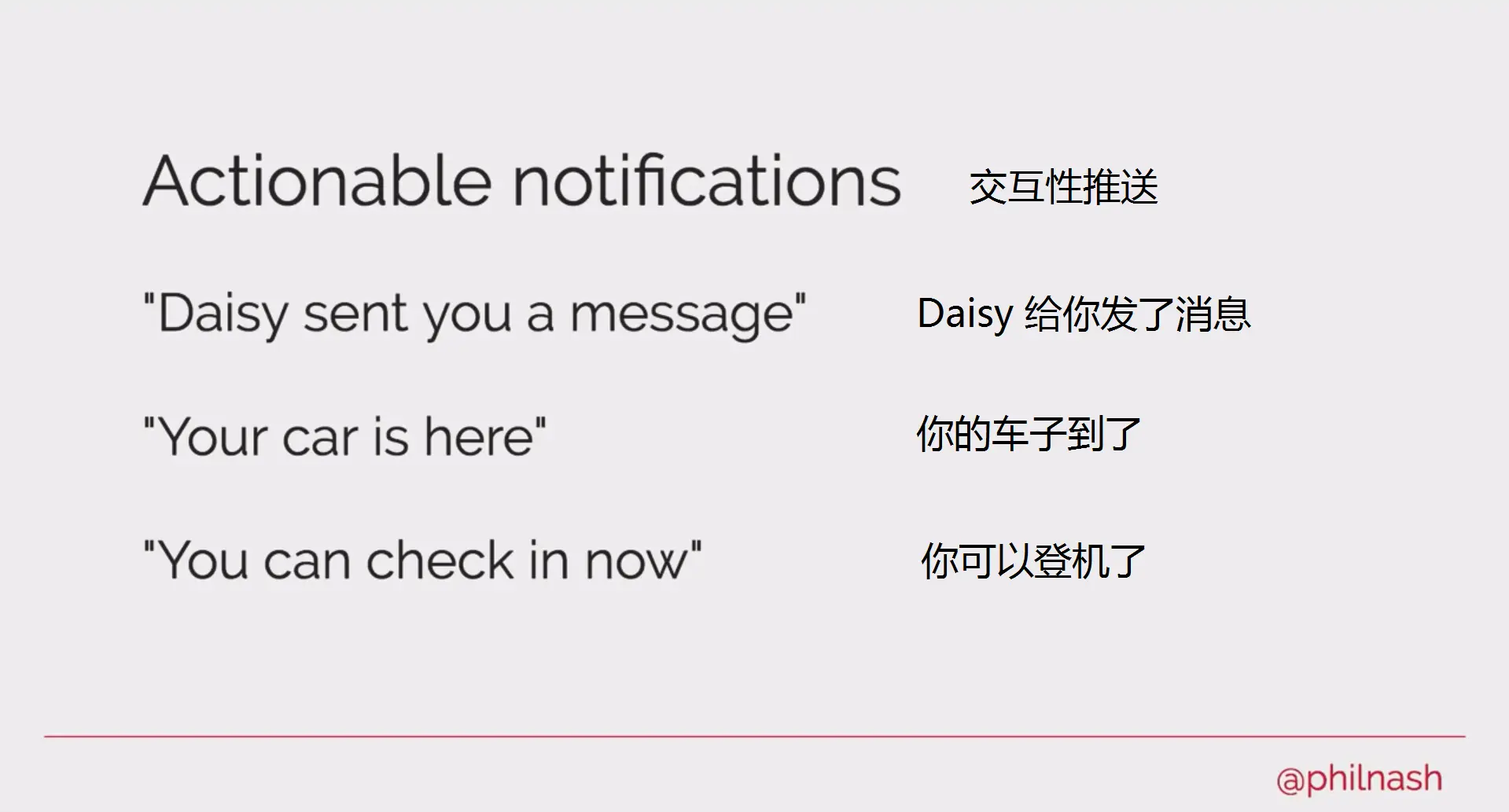 交互性:有人发送给用户一个消息,快递或预定的车辆到达,航班开始登机,这些指引用户去做一些操作的,消息与用户之间存在某种交互的。
