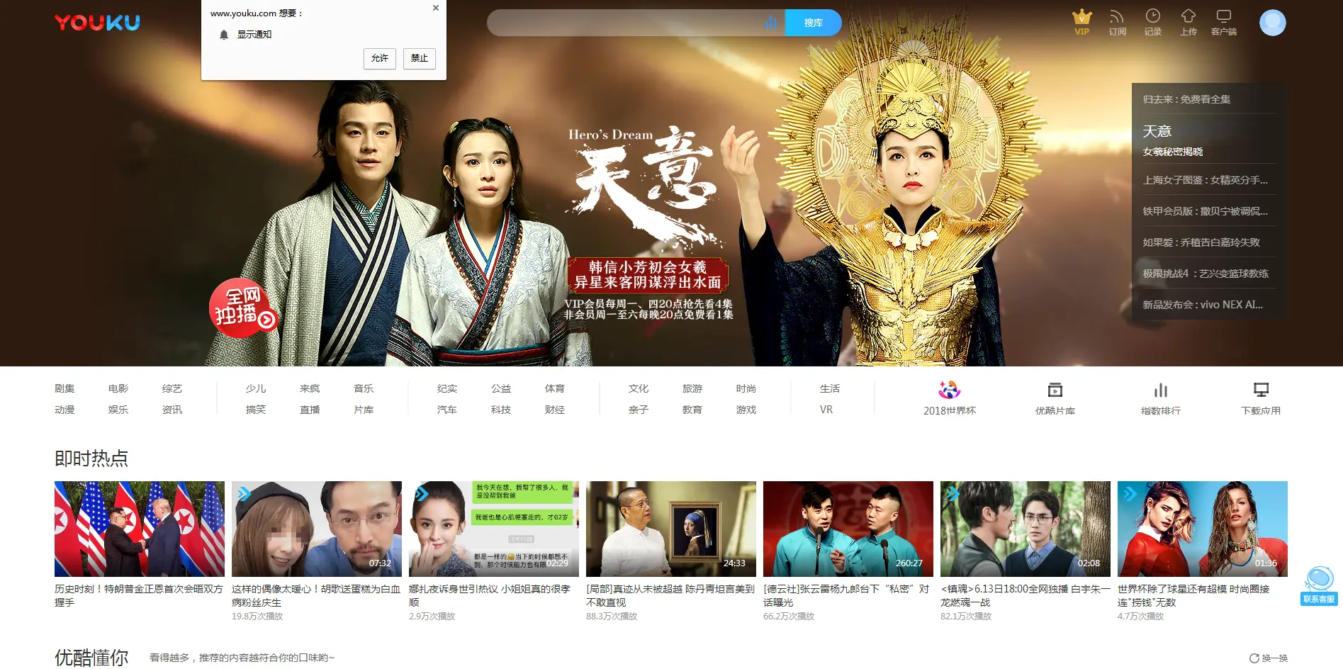 图片中显示这是一个视频网站的首页,用户并不知道开启推送后会给他带来什么,所以通常没有用户会在此时同意开启权限,就算开启了权限,用户接收到了他不想收到的推送,他也会产生厌倦,进而关闭该网站的推送权限,甚至关闭整个浏览器的推送权限,这都是开发者非常不愿意看到的。