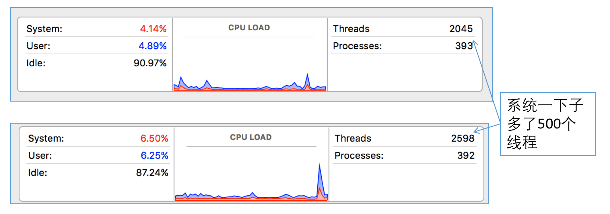 你会发现操作系统一下子多了500个线程,也就是说JS的多线程是调的系统API创建的多线程。还有一种多线程是用户级别的多线程,这种多线程并不会产生实际的系统线程,它是应用程序自已控制任务切换,如Ruby的Fiber。