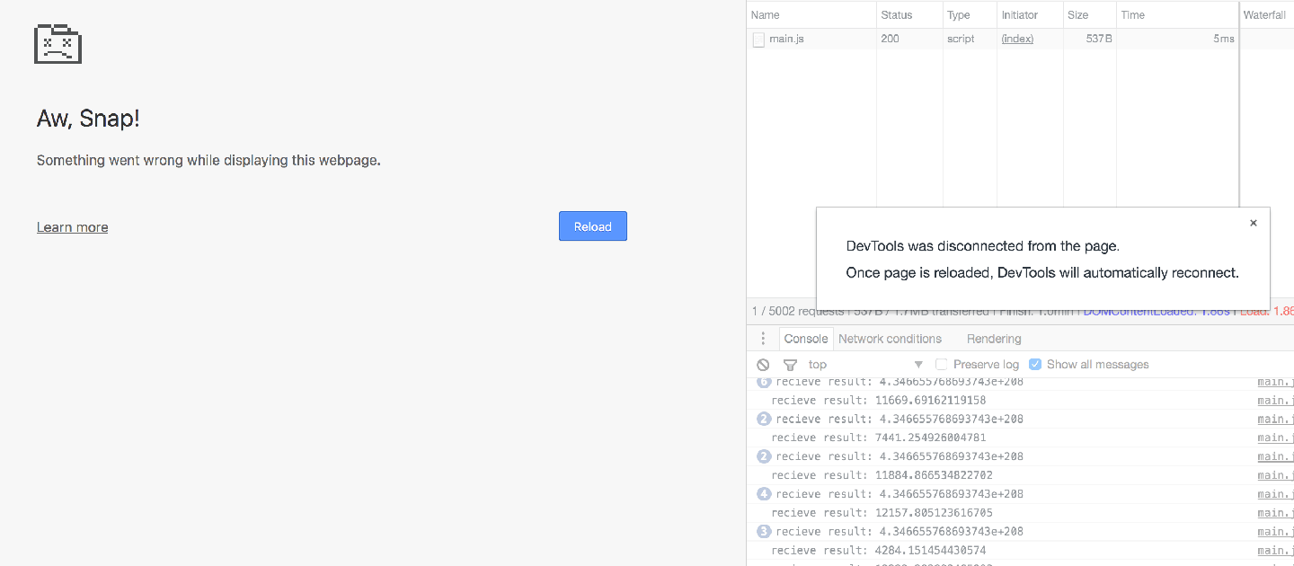 我们一下子开了500个线程,有点任性,如果一下子开5000个呢?首先一个进程最多能有多少个线程,一般操作系统是有限制的,再者你开太多,Chrome会把你这个页面杀了,如下,跑着跑着页面就挂了: