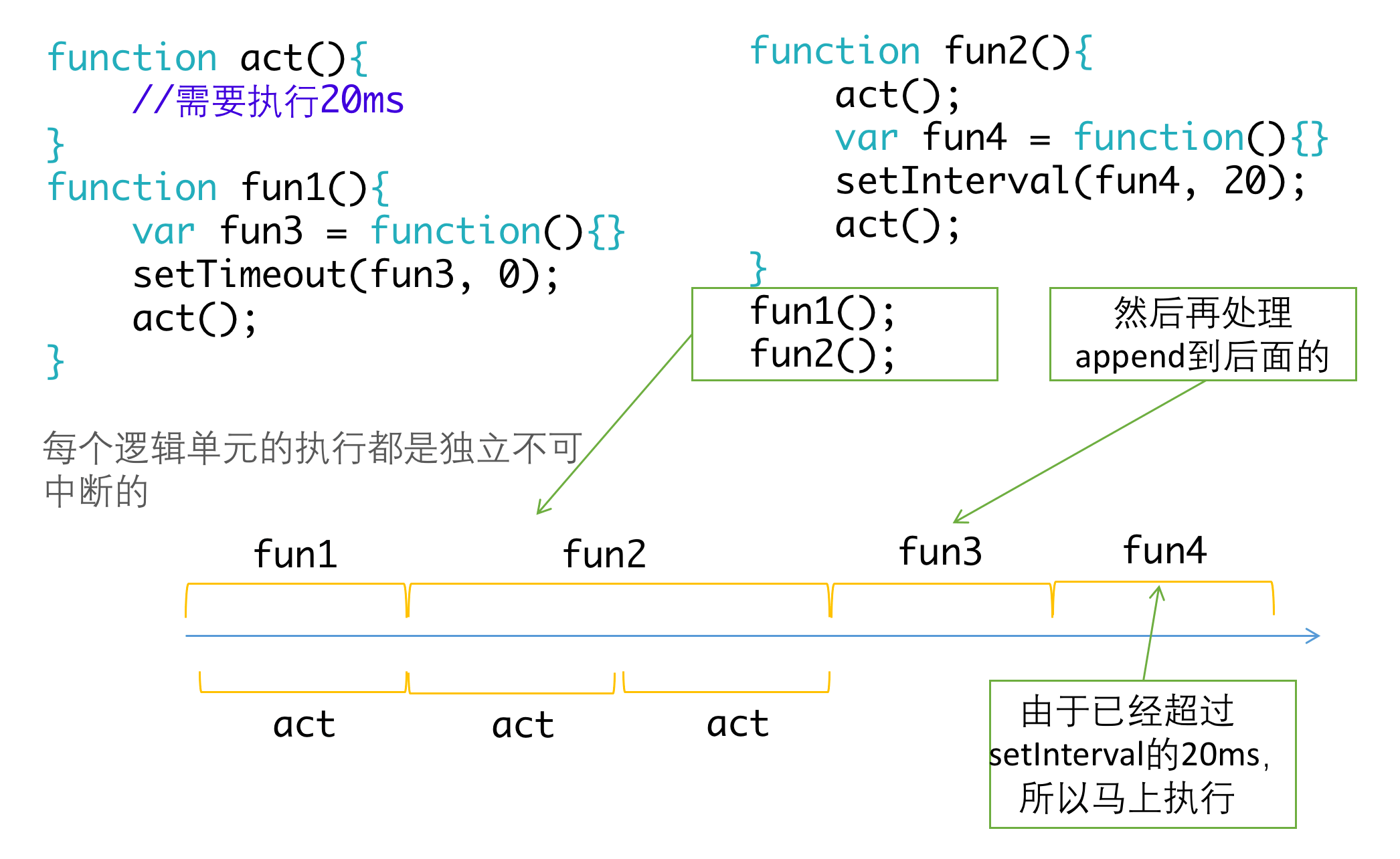 在主逻辑里面fun1和fun2的调用是连在一起的,它是一个执行单元,要么还没执行,要么得一口气执行完。执行完之后,再执行setTimout append到后面的。然后由于已经超过了setInterval定的20ms,所以又马上执行setInterval的函数。这里可以看出setTimeout的计时是从逻辑单元执行完了才开始计时,而setInterval是执行到这一行的时候就开时计时了。