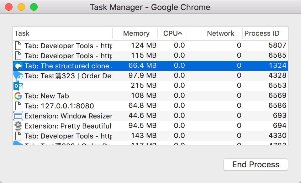每开一个tab,Chrome就会创建一个进程,进程是线程的容器,如下Chrome的任务管理器: