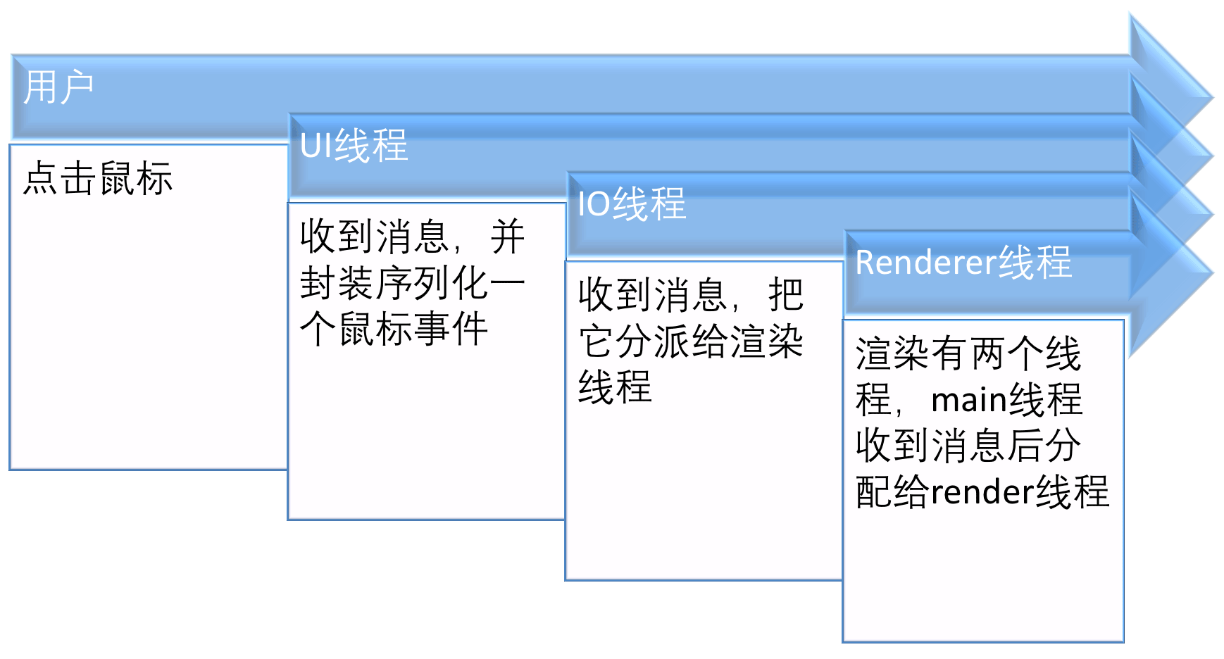 首先用户点击了鼠标,浏览器的UI线程收到之后,这个消息数据封装成一个鼠标事件发送给IO线程,IO线程再分配给具体页面的渲染线程。其中IO线程和UI线程是浏览器的线程,而渲染线程是每个页面自己的线程。