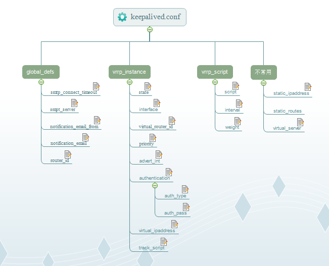keepalived只有一个配置文件keepalived.conf,配置文件里面主要包括以下几个配置项,分别是global_defs、static_ipaddress、static_routes、VRRP_script、VRRP_instance和virtual_server。