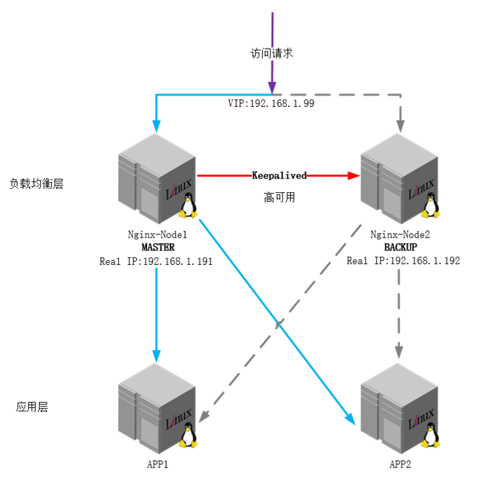 在应用层:可以运行FTP,TELNET,SMTP,DNS等各种不同类型的高层协议,Keepalived的运行方式也更加全面化和复杂化,用户可以通过自定义Keepalived工作方式,例如:可以通过编写程序或者脚本来运行Keepalived,而Keepalived将根据用户的设定参数检测各种程序或者服务是否允许正常,如果Keepalived的检测结果和用户设定的不一致时,Keepalived将把对应的服务器从服务器集群中剔除