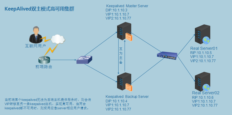 这种方案,使用一个vip地址,前端使用2台机器,一台做主,一台做备,但同时只有一台机器工作,另一台备份机器在主机器不出现故障的时候,永远处于浪费状态,对于服务器不多的网站,该方案不经济实惠。