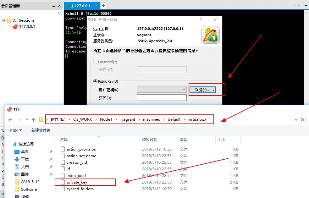 Private key: E:/OS_WORK/Node1/.vagrant/machines/default/virtualbox/private_key这样我们就可以像连接到一台服务器一样进行操作了。2.ssh登录