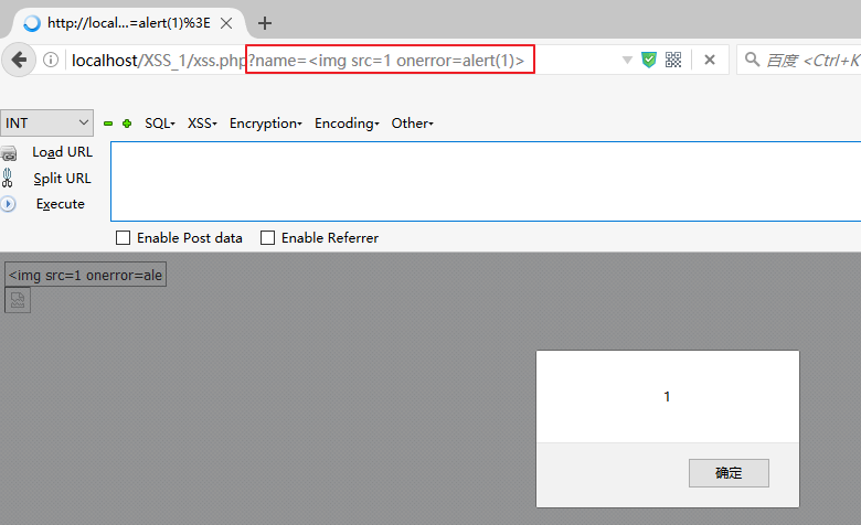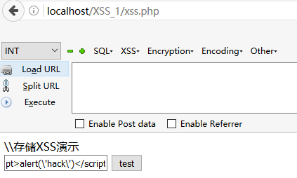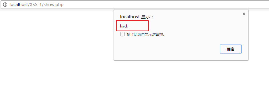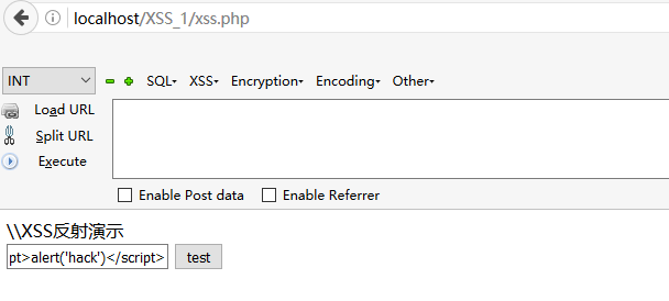 部署好这个文件,访问http://localhost/xss.php,直接输入一个js代码,比如<script>alert('hack')</script>,
