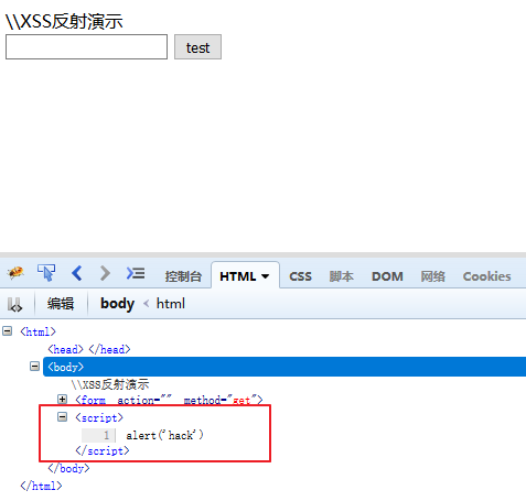 我们输入的HTML代码被执行了。用Firebug查看,我们输出的内容直接插入到了页面中,解释为<script>标签。