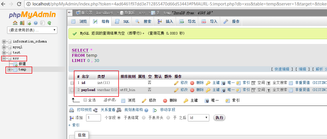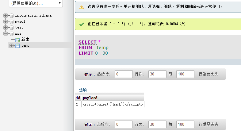 $sql="insert into temp(id,payload) values('1','$xss')";