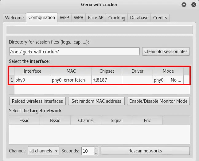 从该界面可以看到wlan0成功启动为监听模式。此时使用鼠标选择wlan0mon,在Select the target network下单击Rescan networks按钮对wifi进行扫描。