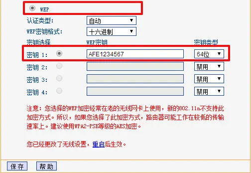 首先设置下路由器加密方式为WEP,并设置好秘钥