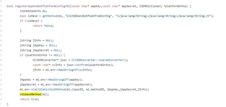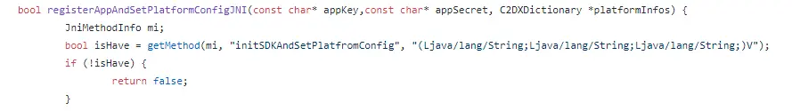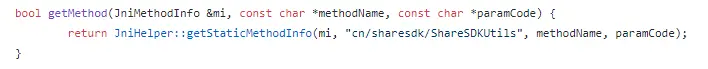 JniMethodInfo对象的引用,函数执行中会把jniEvn、classid、methodid写入到引用中,如果方法是带返回值的,则可以这样调用带数据类型的方法: