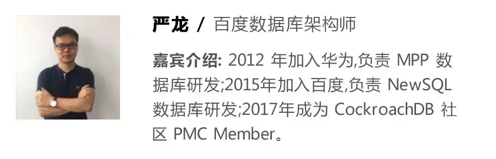 内容来源:2017 年 11 月 18 日,百度数据库架构师严龙在“第七届数据技术嘉年华”进行《百度NewSQL-CockroachDB》演讲分享。IT 大咖说(微信id:itdakashuo)作为独家视频合作方,经主办方、演讲者以及微信公众号——CockroachDB(微信id:CockroachDB)审阅授权发布。