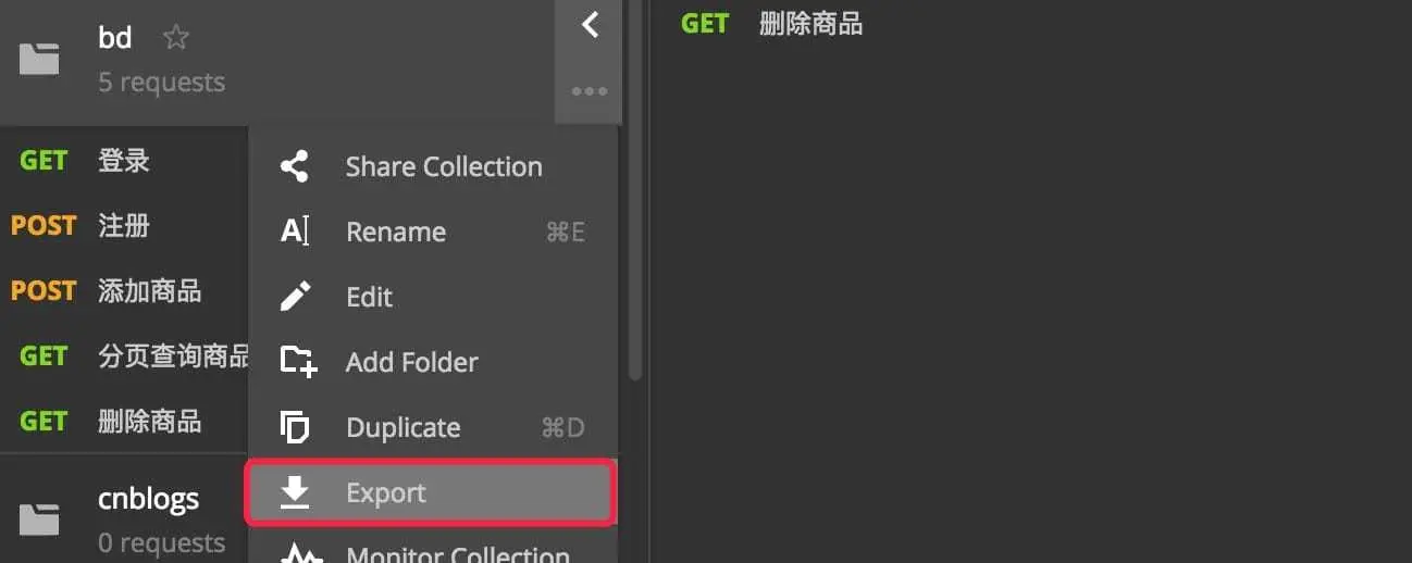 postman可以将测试的接口进行collections分组,分组后的一组接口可以进行导出,如图: