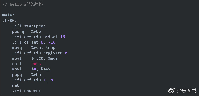 上述命令生成的汇编程序hello.s的代码片段如下所示,其全部为汇编代码。
