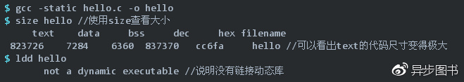 如果使用命令“gcc -static hello.c -o hello”则会使用静态库进行链接,生成的ELF可执行文件的大小(使用Binutils的size命令查看)和链接的动态库(使用Binutils的ldd命令查看)如下所示: