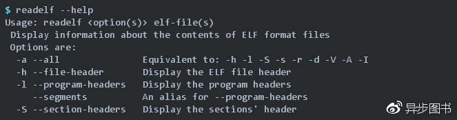 可以使用Binutils中readelf来查看ELF文件的信息,可以通过readelf --help来查看readelf的选项: