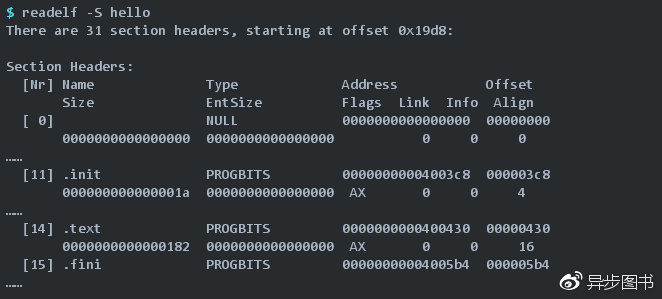 以本文Hello World示例,使用readelf -S查看其各个section的信息如下: