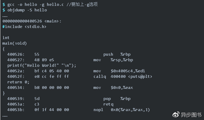 以本文Hello World示例,使用objdump -D对其进行反汇编如下: