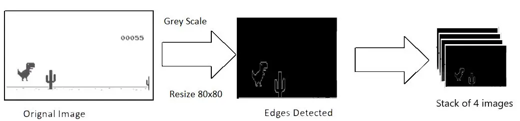 获取得到的原始图像的分辨率大约是 600×150,有 3 个通道(RGB)。我们打算使用 4 个连续截屏作为该模型的单个输入。这会使得我们的单个输入的维度高达 600×150×3×4。这样的计算成本很高,而且并非所有特征都对玩游戏有用。所以我们使用 OpenCV 库对图像进行尺寸调整、裁剪和处理操作。处理后得到的最终输入图像尺寸只有 80×80 像素,且只有单个通道(灰度)。