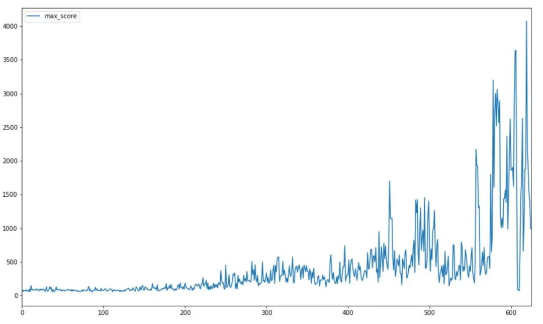 最高分记录超过 4000,远远超过之前模型的 250(也远远超过了大多数人类的水平!)。下图给出了训练阶段游戏最高分的变化(每 10 局游戏选取一个最高分)。