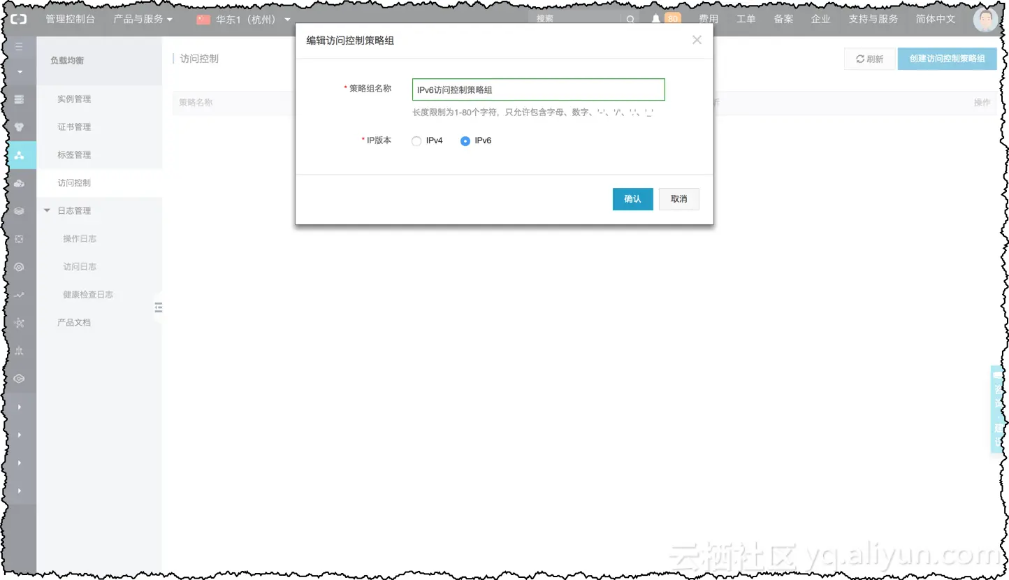 在访问控制菜单中,当我们新建一个访问控制策略组时,可以看到有IP版本的选项,选择IPv6即可创建IPv6访问控制策略组