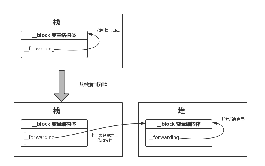 长话短说。当一个栈 block 捕获了一个在栈上生成的 __block 变量,那么随着 block 从栈上 copy 到堆上,这个 __block 变量也从栈上 copy 到堆上。因为有一个 __forwarding 指针,使得无论从从栈上还是堆上,访问的都是一个变量。如果没有明白看下面的图和代码。