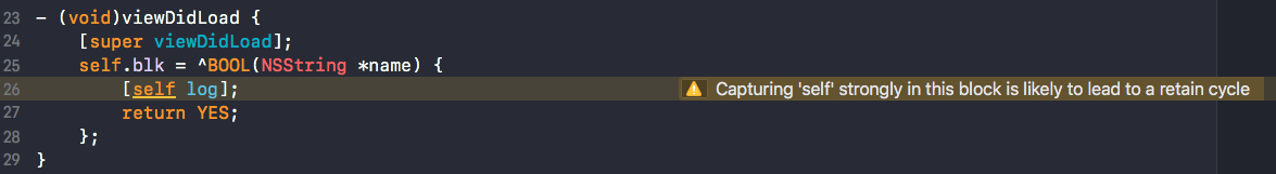 上图中 self 持有 blk 属性,blk 持有 block,block 持有 self,这就形成了一个环。现如今的 Xcode 已经很智能,这种简单的循环引用,会出现警告。