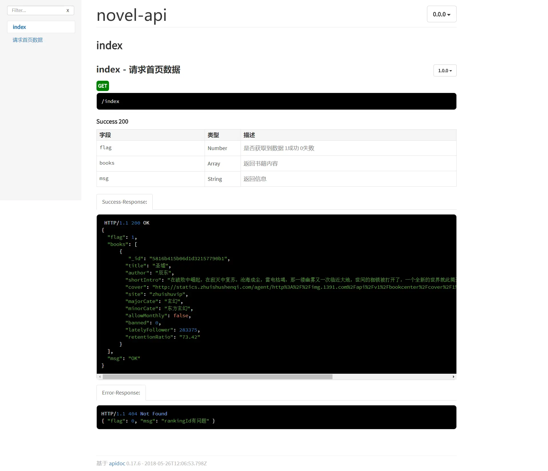 routes/ 要输出API文档的文件夹。 public/ 输出文档到public文件夹,没有回自动创建。 执行 npm run doc 访问 http://localhost:3000/ 就可以看到生成好的API文档了。
