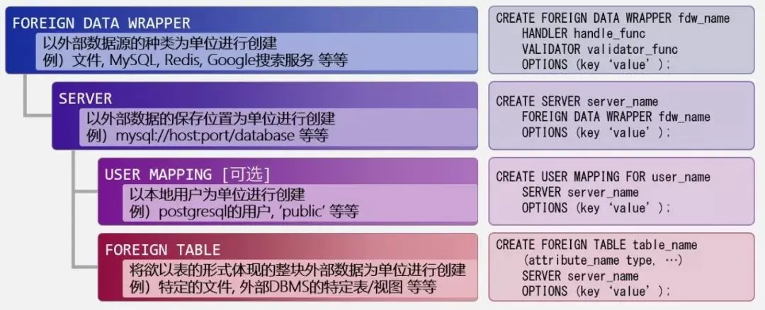 上一小节介绍了FDW的通用用法,这里将简单说明一下该用法中提及的几个数据库对象的作用: