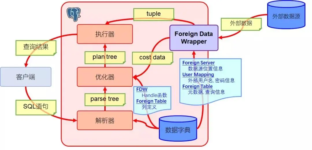 有了上述外部对象相关的元数据支持,当一个查询试图访问外部表以获取外部数据源的数据时,FDW在整个查询的执行过程中就可以发挥下述作用: