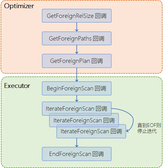 如上文所说,一个FDW实现的核心就是实现一组回调函数。有了这些回调函数的帮助,在查询外部表对象的执行过程中就可以将运行逻辑切换至自定义的扩展代码中,进而遵照PG的内部机制实现对外部数据源的访问。