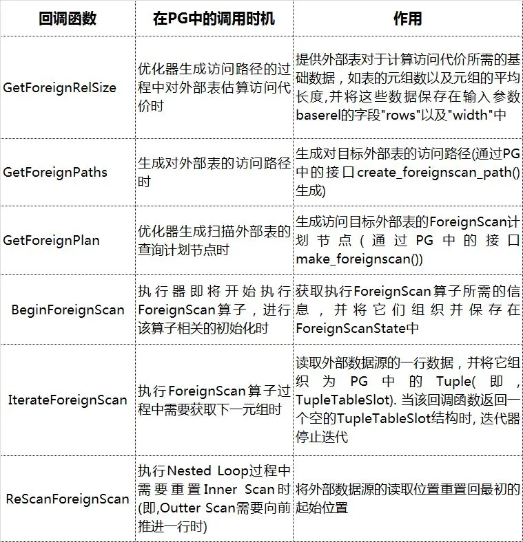 需要补充说明的是,HANDLER的作用是将该FDW实现的一系列fdw回调函数的地址打包返回给PG,从而使PG之后访问外部表时可以调用这些访问外部数据的函数。而所谓的fdw回调函数则是指PG手册所提及的下述接口的实现: