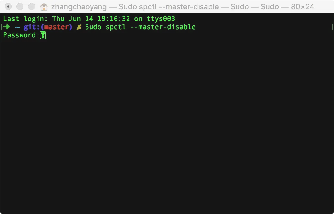 2、打开终端,在终端运行命令(需要输入密码):Sudo spctl --master-enable