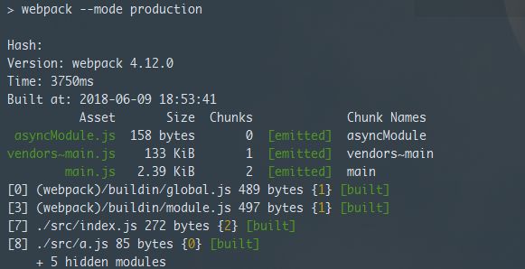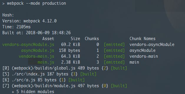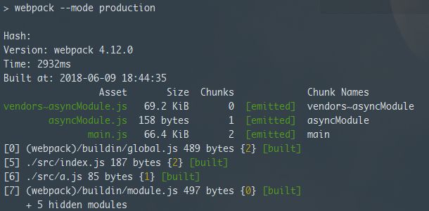 //index.jsimport Vue from 'vue'import _ from 'lodash'import(/* webpackChunkName: "asyncModule" */'./a.js') .then(mod => { console.log('loaded module a', mod) })console.log('initial module')console.log(_.map([1,2,3], a => { return a * 10}))new Vue({})//a.jsimport _ from 'lodash'const obj = { name: 'module a' }export default _.clone(obj)