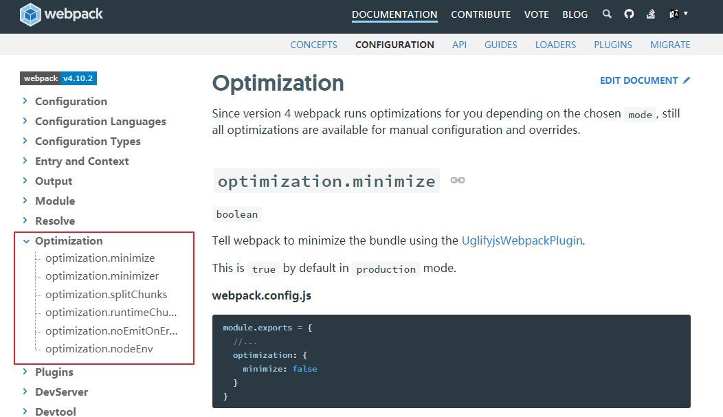 如果想查看更多webpack4相关的默认配置,到这里来。可以看到webpack4把很多插件相关的配置都迁移到了optimization中,但是我们看看官方文档对optimization的介绍简直寥寥无几,而在默认配置的代码中,webpack对optimization的配置有十几项,反正我是怕了。