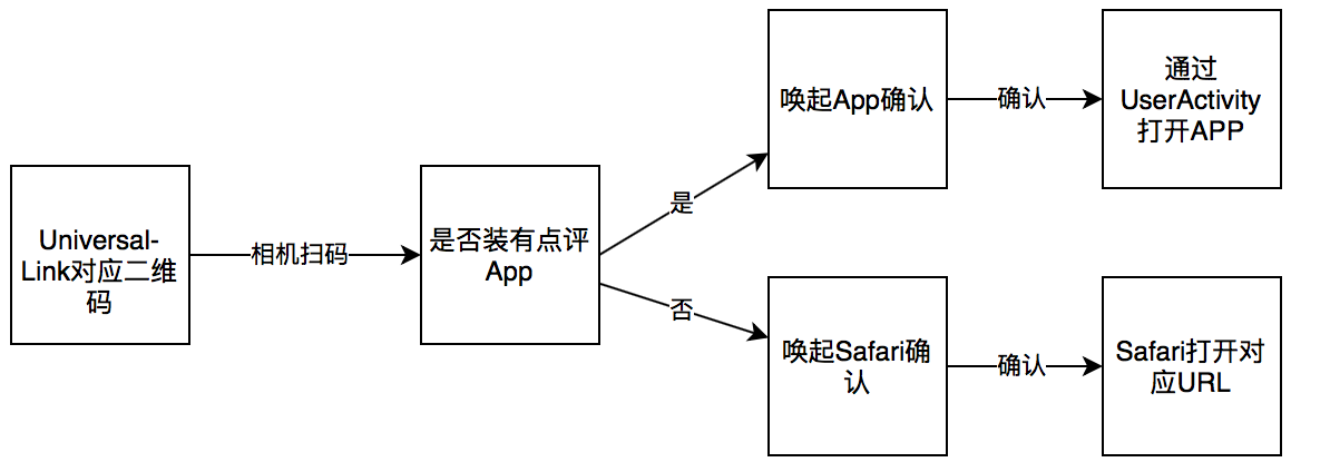 具体方案:将一个Universal-Link链接对应的二维码作为物料投放,用户直接使用系统“相机”扫描此二维码,如果装有大众点评App,会出现“是否用大众点评打开”的提示框,点击即进入App。如下所示: