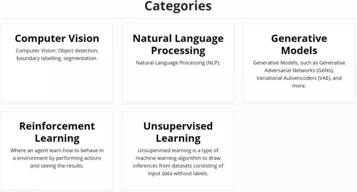 目前,该项目内的深度学习模型有五大分类:计算机视觉、自然语言处理、生成模型、强化学习和无监督学习。这些类别或领域相互之间是有交叉的,例如很多生成模型都可以归为无监督学习,实际上很多模型确实归为了多个类别。