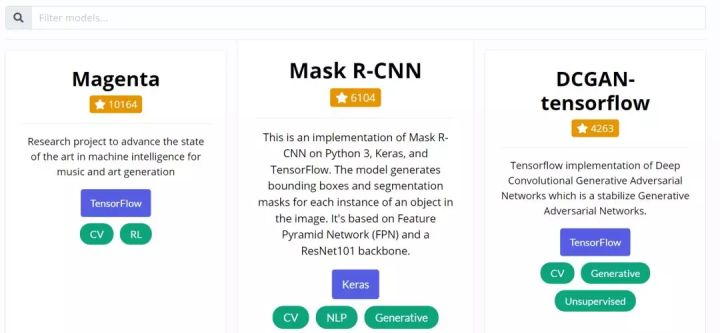 一直以来,研究者与开发者都经常在 GitHub 宝库中搜索比较有意思的项目与实现,但我们可能需要一个确切的主题,并做一些筛选。近日有开发者发布了一个模型聚合平台,我们可以分领域在上面搜索到当前最为流行的开源模型。作者根据 GitHub 项目收藏量、项目所属领域、实现框架等特点对这些模型分类,因此我们能快速定位合适的模型。