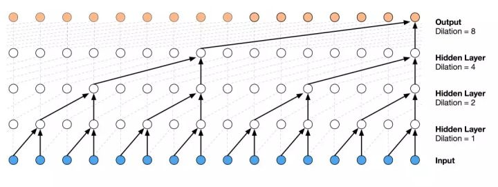 下图展示了 WaveNet 的主要结构,这是一个完全卷积的神经网络,其中的卷积层有不同的扩张系数(dilation factors),这让其感受野可根据层级深度指数式地增长并可覆盖数千个时间步骤。此外 Wave Net 还是第一个提出因果卷积的模型,从直观上来说,它类似于将卷积运算「劈」去一半,令其只能对过去时间步的输入进行运算。其实后来很多使用卷积网络处理序列标注问题的模型都借鉴了 WaveNet 所提出的这两个结构。
