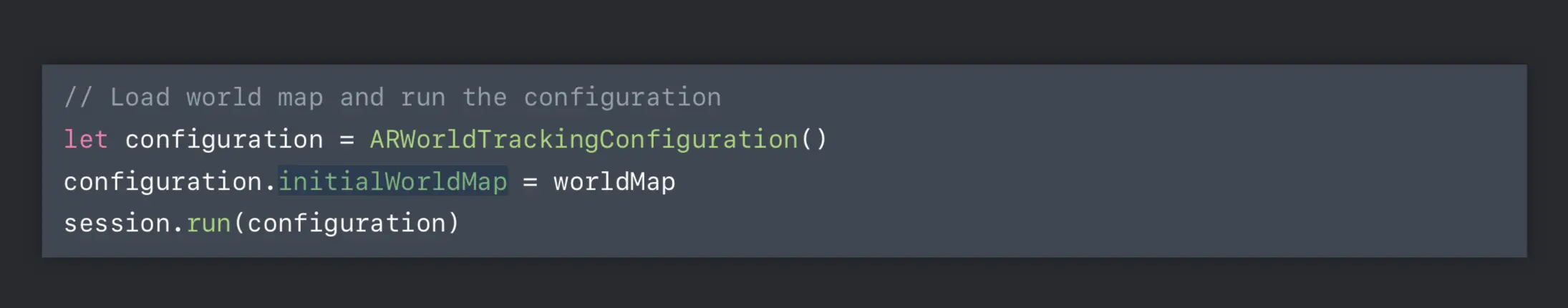 取得 WorldMap 之后,只要在初始化 ARWorldTrackingConfiguration 时给 initialWorldMap 属性赋值并运行即可,或者通过配置 ARSession 的 configuration 并运行即可实现动态改变。