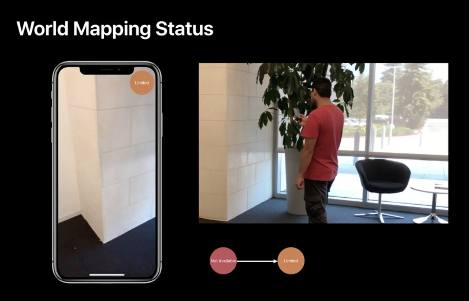 刚启动世界追踪时,WorldMappingStatus 处于 Not Avaiable 状态,开始扫描物理空间后,状态就会变为 Limited:
