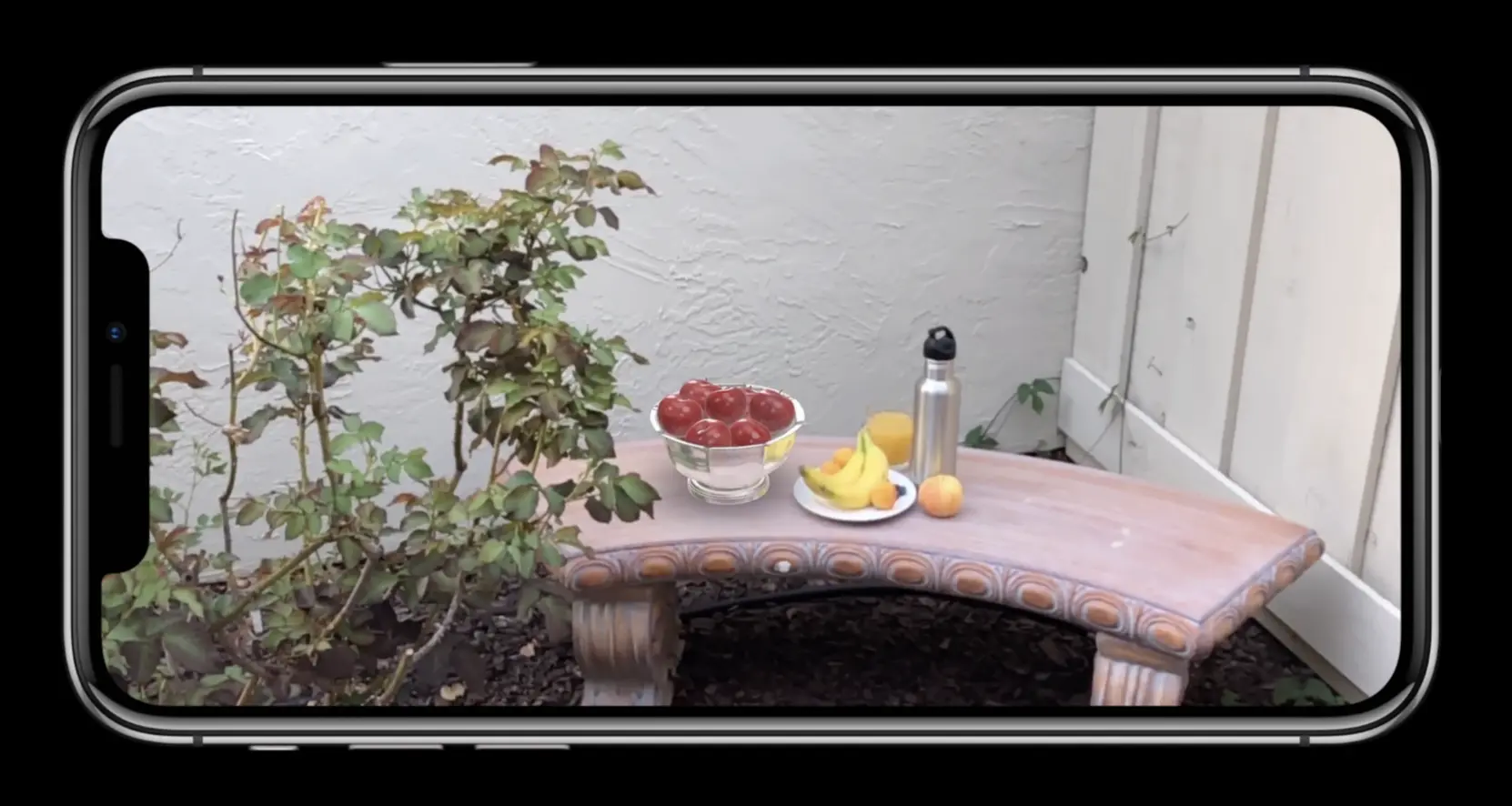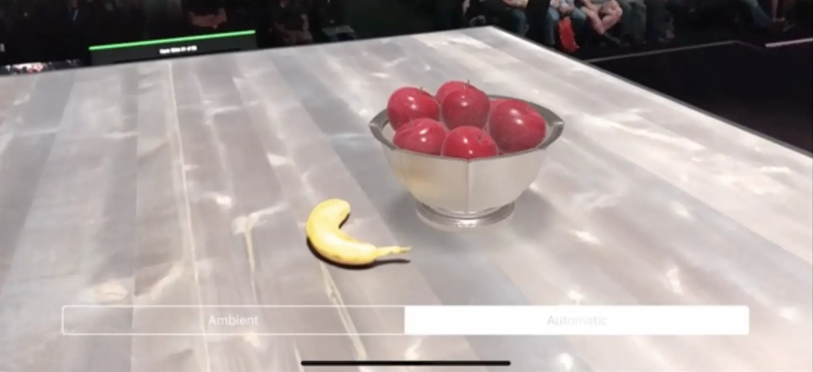 可以看到,尺寸恰当,但更重要的是,在物体表面可以看到周围环境的反射,右面可以看到黄色的香蕉和橙子的反射,左面则可以看到绿叶的反射,中间还能看到板凳表面的反射,这些就是 ARKit 2 的环境纹理的强大功能。