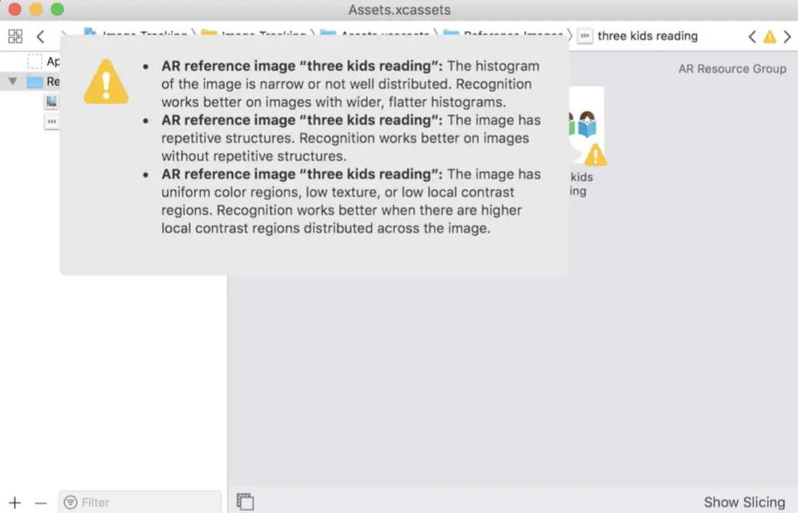 如果我把上面的图片导入 Xcode,会发现左侧那张图片没有警告,也就是说它是被建议使用的。然而右面那张 three kids reading 则出现了警告图标,说明不建议使用它,如果点击该图标,可以看到不建议用于图像追踪的详细原因: