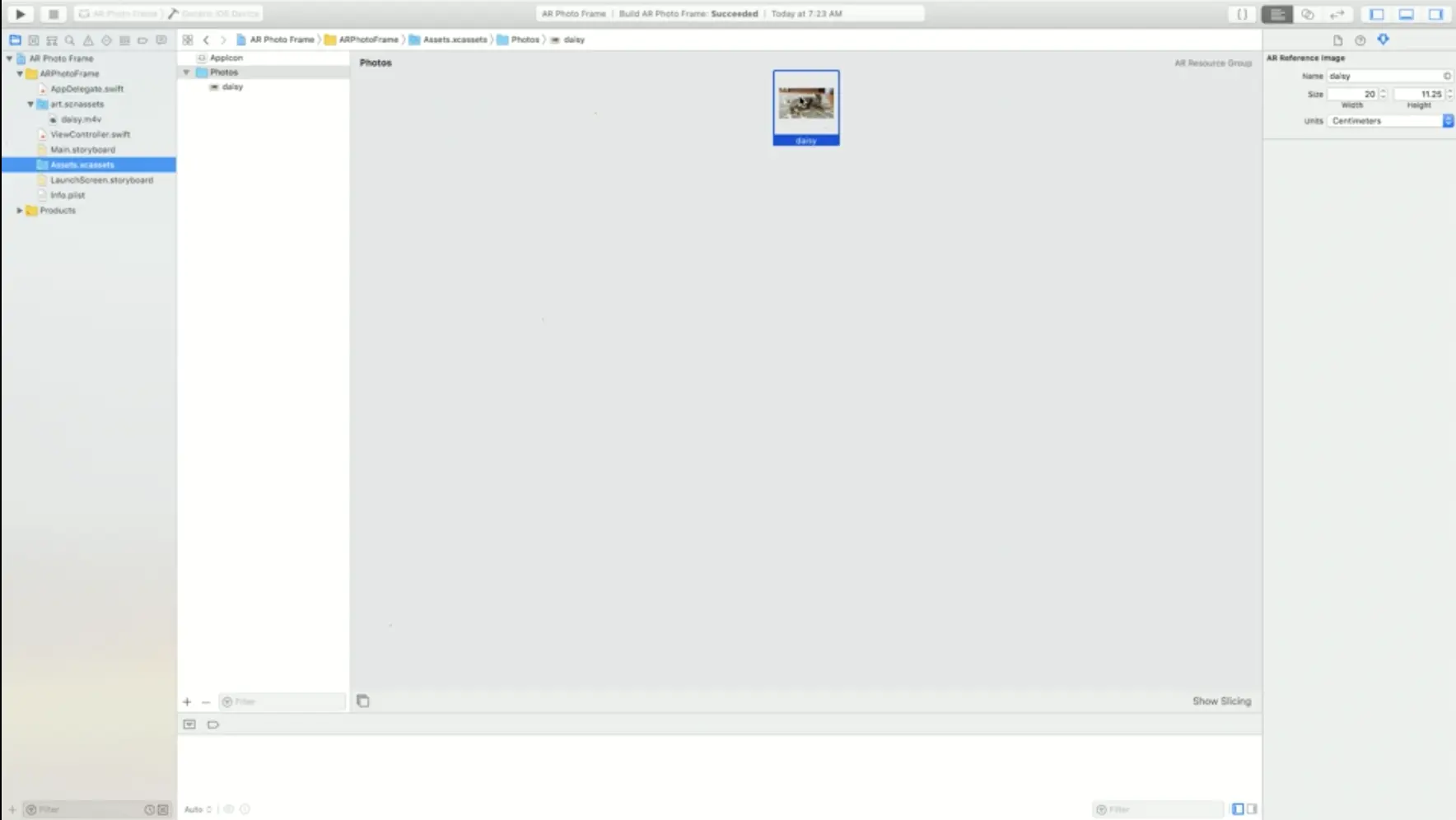在属性面板将此图片命名为 daisy,同时指定该图像文件在真实世界的尺寸,也就是相框的尺寸。此外还在 Xcode 中载入了一段 daisy 的视频: