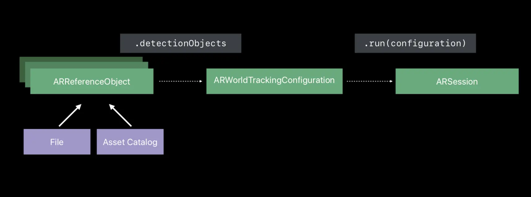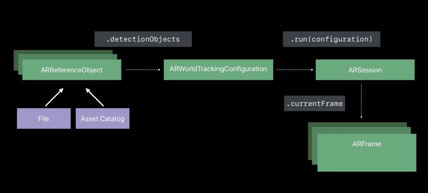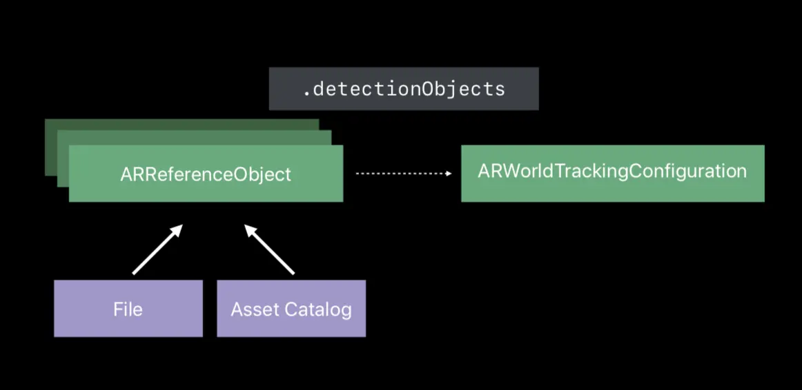 从文件或 Asset Catalog 中加载 ARReferenceObject 数组,然后将其设置为 ARWorldTrackingConfiguration 的 detectionObjects 属性:
