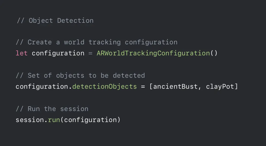 首先创建一个 ARWorldTrackingConfiguration 类型的 configuration,然后指定想要检测的物体数组(古代半身雕像以及陶罐),最后用它来运行 session。
